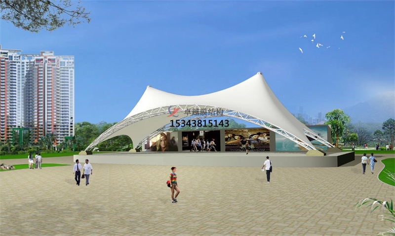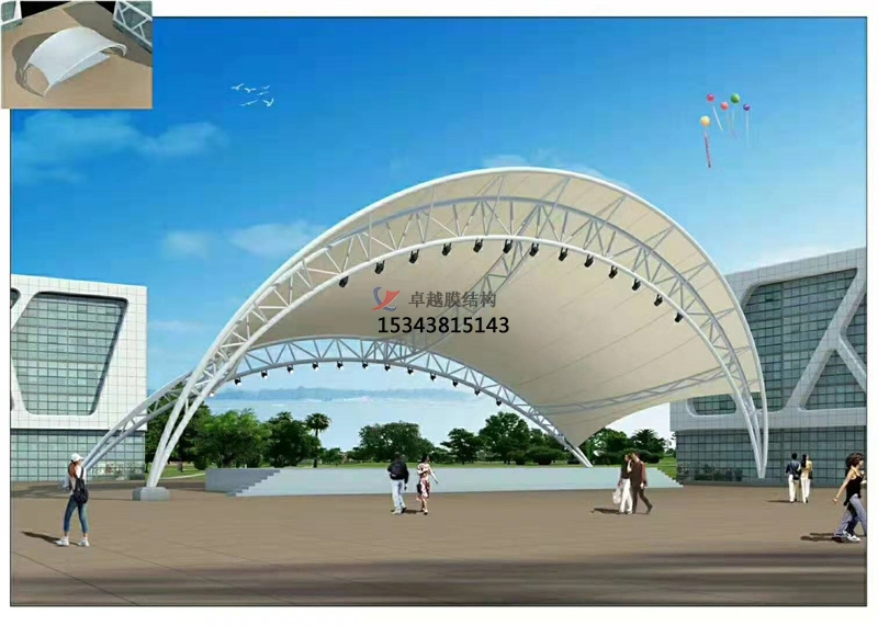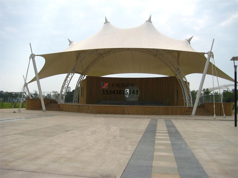 五、舞臺膜結構結構耐久性:常用膜材抗拉強度達到3000--6000N/5CM,已接近或達到鋼材的抗拉強度。 一般膜材使用期限在15年以上,經久耐用。